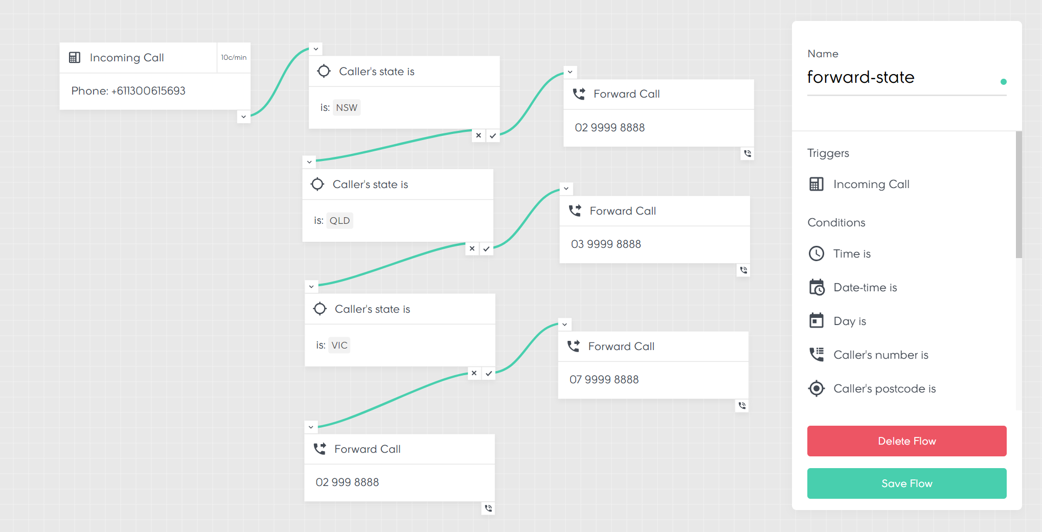 Note how multiple Caller's state is conditions are chained. Also, it is important to consider that the state is unknown for mobile numbers. In this example, all mobile numbers and callers from overseas or outside QLD, NSW, VIC will be directed to 02 9999 8888.
