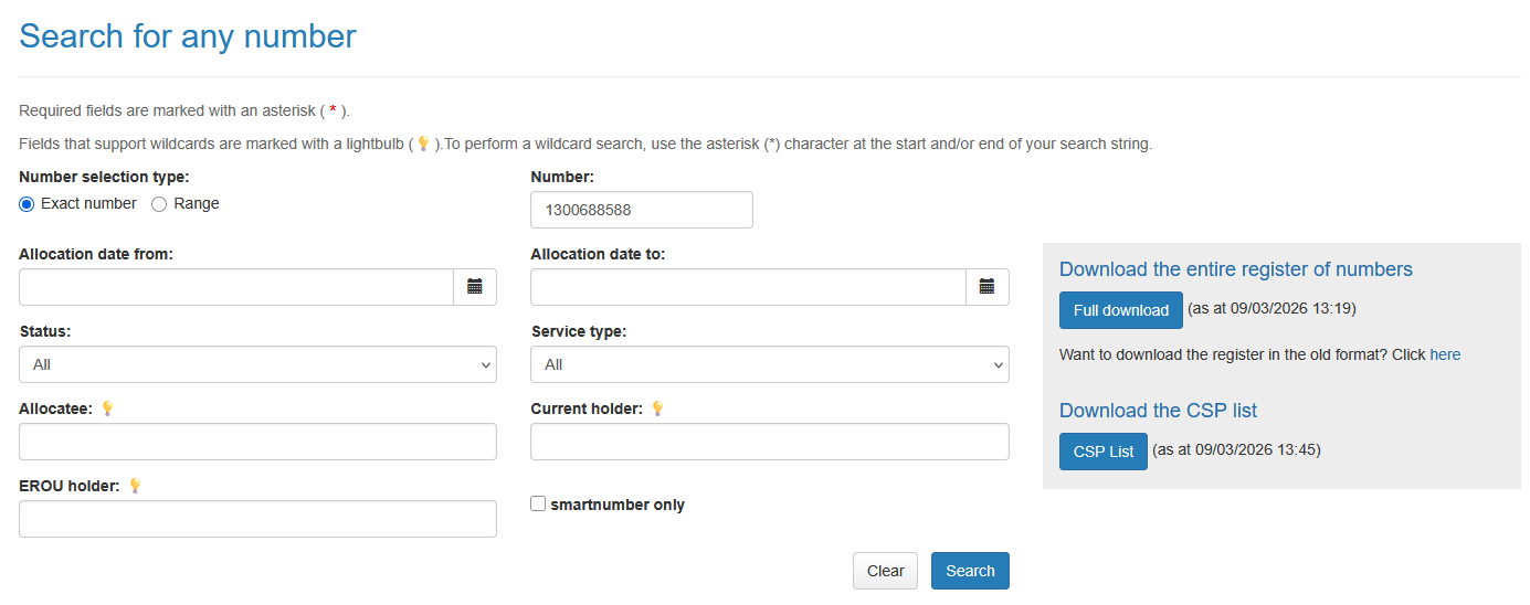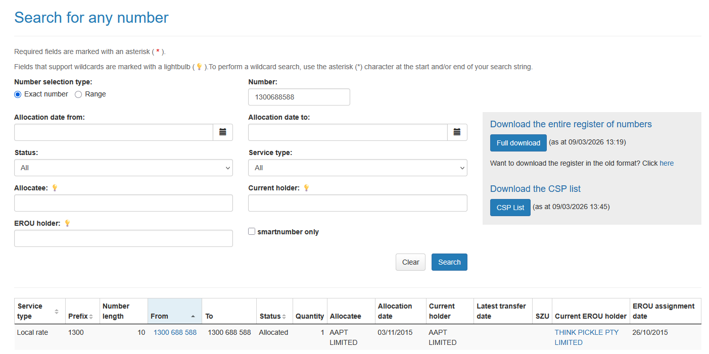 To search for a number, open the ACMA number register: